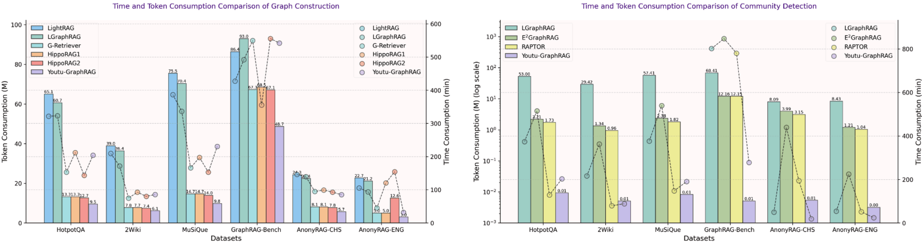 我们在 GraphRAG-Bench、HotpotQA 和 MuSiQue 等六个专业跨领域多语言的基准数据集上进行了广泛实验,充分证明了 Youtu-GraphRAG 的企业级扩展性和泛化性。相比最先进的基线方法,显著推动了帕累托前沿突破,实现了最高 33.6% 的 Token 成本节约和 16.62% 的精度提升。